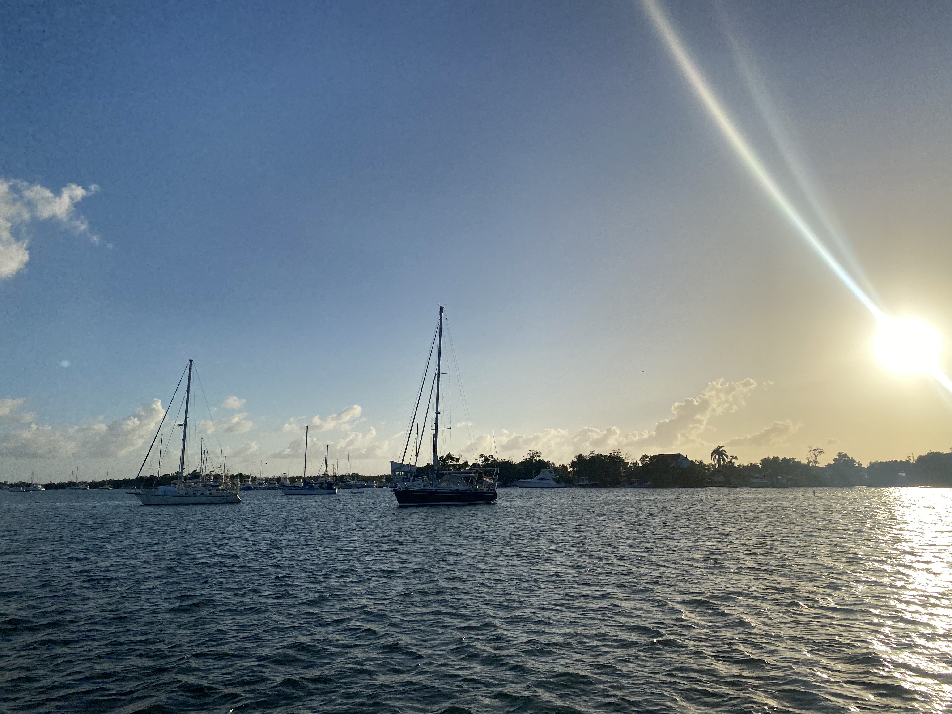 We vertrekken vroeg in de ochtend om zo min mogelijk tegenwind te hebben. Het zal vooral het eerste stuk motoren worden tegen wind en stroom. Als we eenmaal op zee zijn blijkt de boot nauwelijks snelheid te willen maken op de motor. Het lange stilliggen in de, blijkbaar zeer voedzame, baai van Salinas heeft waarschijnlijk gezorgd voor veel aangroei van pokken en plantjes op de schroef en de romp. Uiteindelijk besluiten we een extra stop in te lassen bij Patillas om eerst schroef en onderwaterschip te ontdoen van alle aangroei. De Puerto Patillas blijkt een prima beschutte baai waar het goed ankeren is op ondiep water met een zandgrond met wat zeegras. Anker erin, duikspullen aan en aan de slag dus. Dankzij de Coppercoat op onze romp zat de aangroei nauwelijks vast en was die er met een ijskrabber makkelijk af te schrapen. De schroef zat flink vol met pokken en de saildrive was voorzien van diverse mooie plantjes. Na een uur noeste arbeid is het onderwaterschip weer mooi glad en blinkt de schroef je onder water tegemoet. We genieten va het uitzicht en de ondergaande zon. Morgen verder naar Vieques.