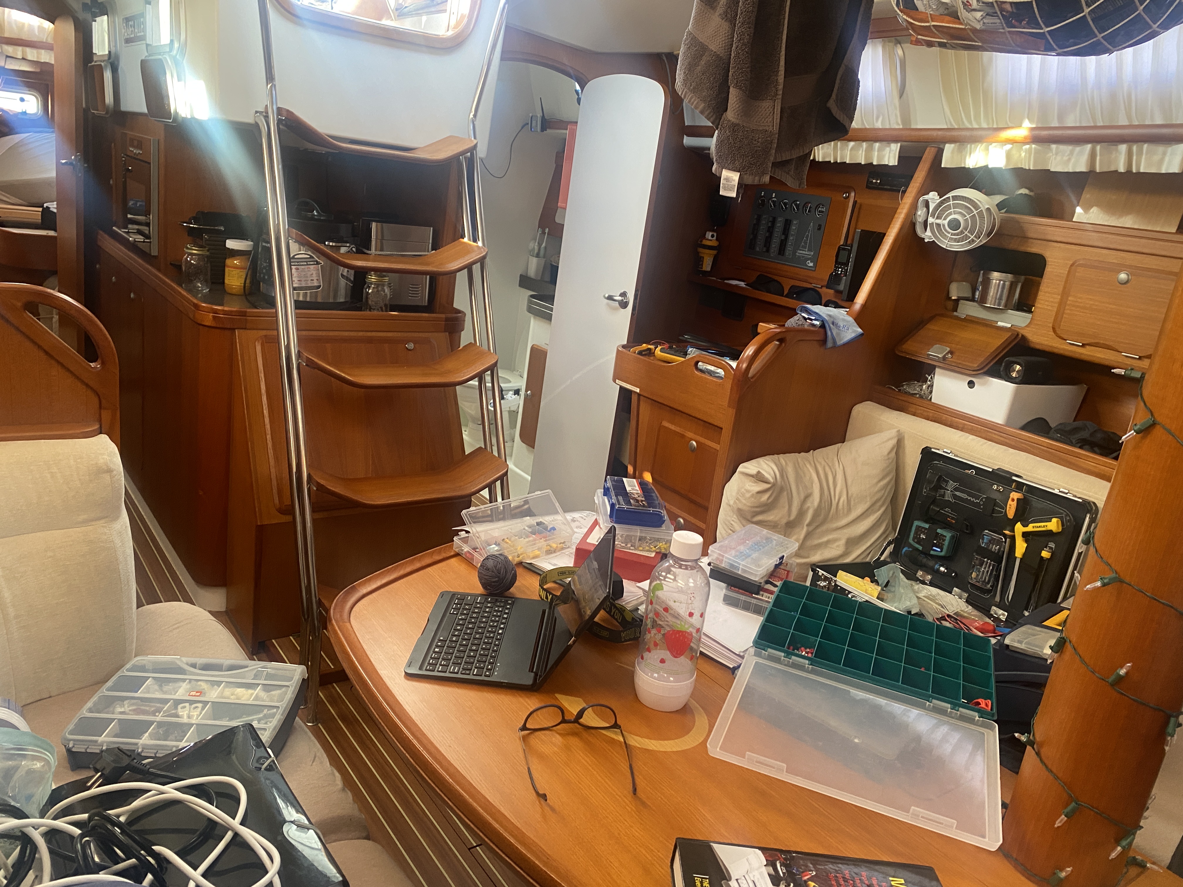 Bij aankomst controleer ik meestal even snel het motorruimte op eventuele lekkages. Helaas is het dit keer prijs. Er ligt een flinke plas olie onder het motorblok en nader onderzoek wijst uit dat het niet de motor zelf maar de saildrive is die olie lekt via de as die de koppeling met de aandrijfas met de motor verzorgt. Conclusie: de oliekeerring die de afsluiting van de as verzorgt moet worden vervangen. Een vervelende klus want dit betekent dat de motor van zijn plaats moet om ruimte te creëren om de oliekeerring te vervangen. Nu hebben we veel reserveonderdelen aan boord maar een dergelijke oliekeerring ontbreekt. Uit overleg met Dieselparts Rotterdam blijkt dat ik het bij het juiste eind heb maar dat als de motor vergenoeg naar voren kan worden geschoven de saildrive op zijn plaats kan blijven. Dit betekent dat ik de reparatie in het water kan uitvoeren. Uit contact met de lokale Yanmar importeur blijkt het onderdeel daar niet op voorraad en dat moet uit de VS komen. Klinkt simpel maar het is inmiddels kerstmis en dat wordt in Puerto Rico vanaf half december tot aan Drie Koningen in januari gevierd. Ergo de monteur die ik ter assistentie nodig heb is drie weken op vakantie en de levertijd van het onderdeel ongewis. Voorlopige inschatting is dat we tot de 3e week van januari vastliggen in Salinas. Uiteindelijk bood dit oponthoud ook de mogelijkheid wat andere klussen aan boord uit te voeren.