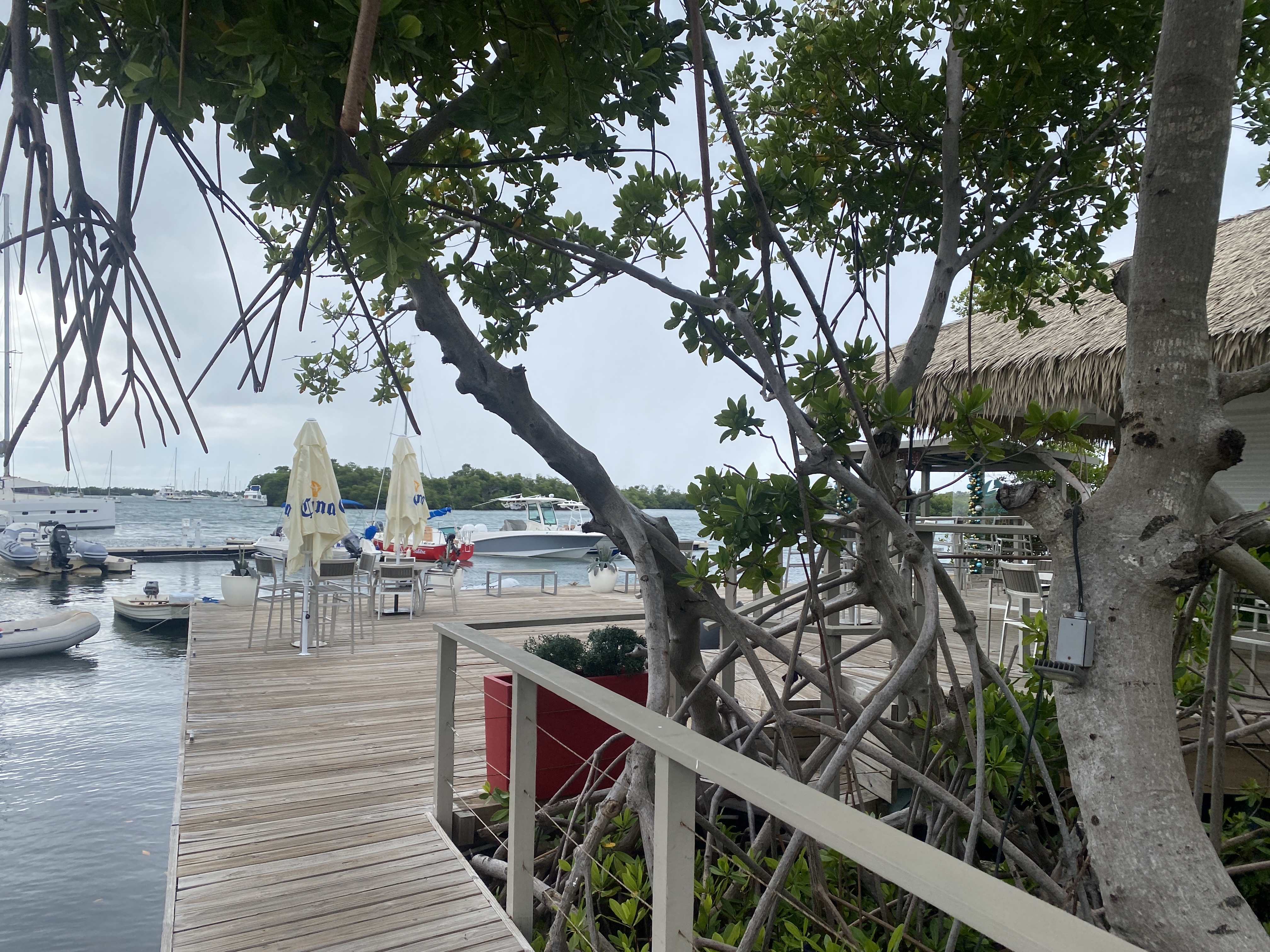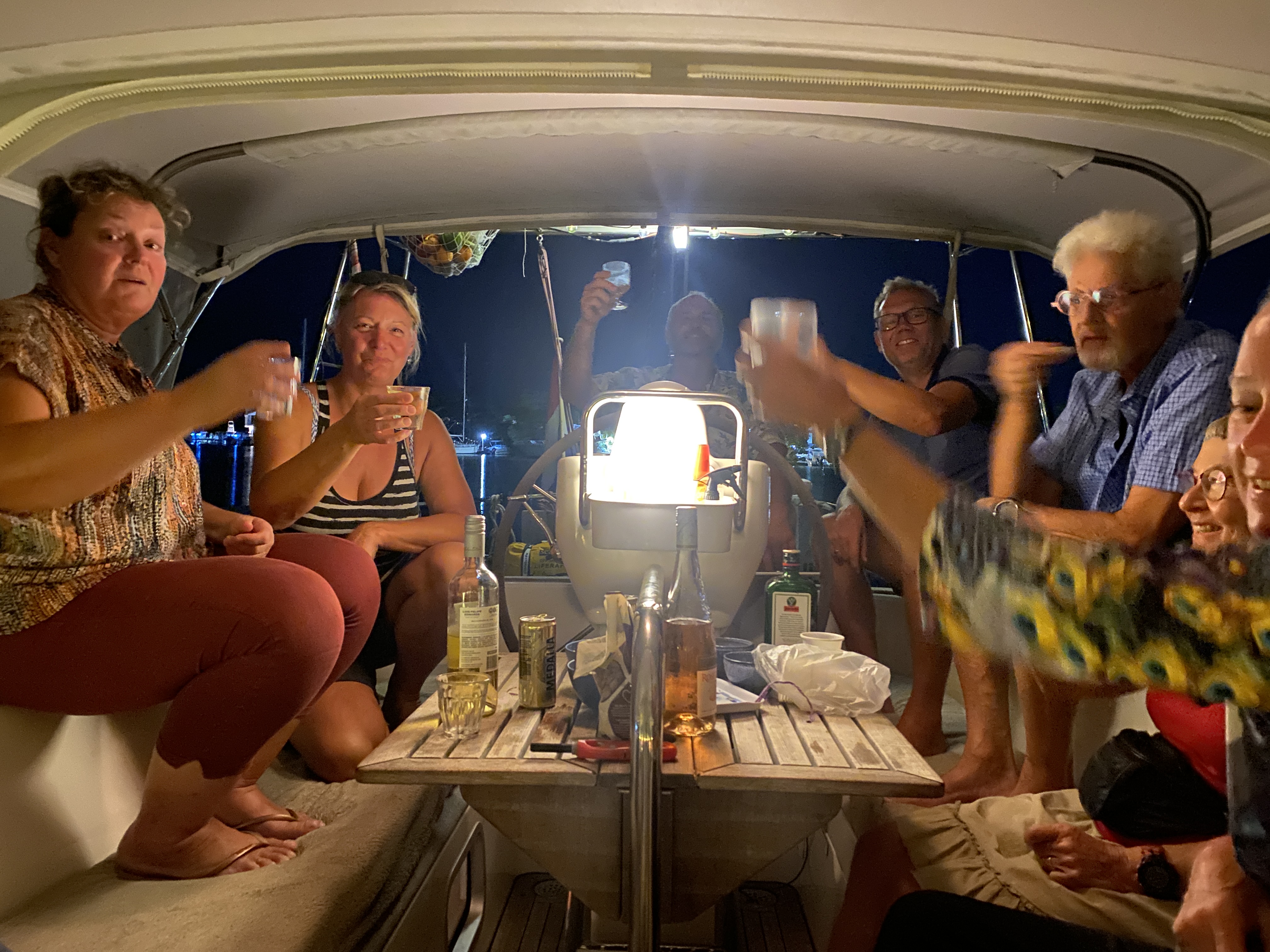Het is druk in de baai en we varen door tot achteraan waar we in ca. 3 meter diep water ankeren. Dit blijkt een prima plek met een korte afstand tot de marina met dinghy steiger.