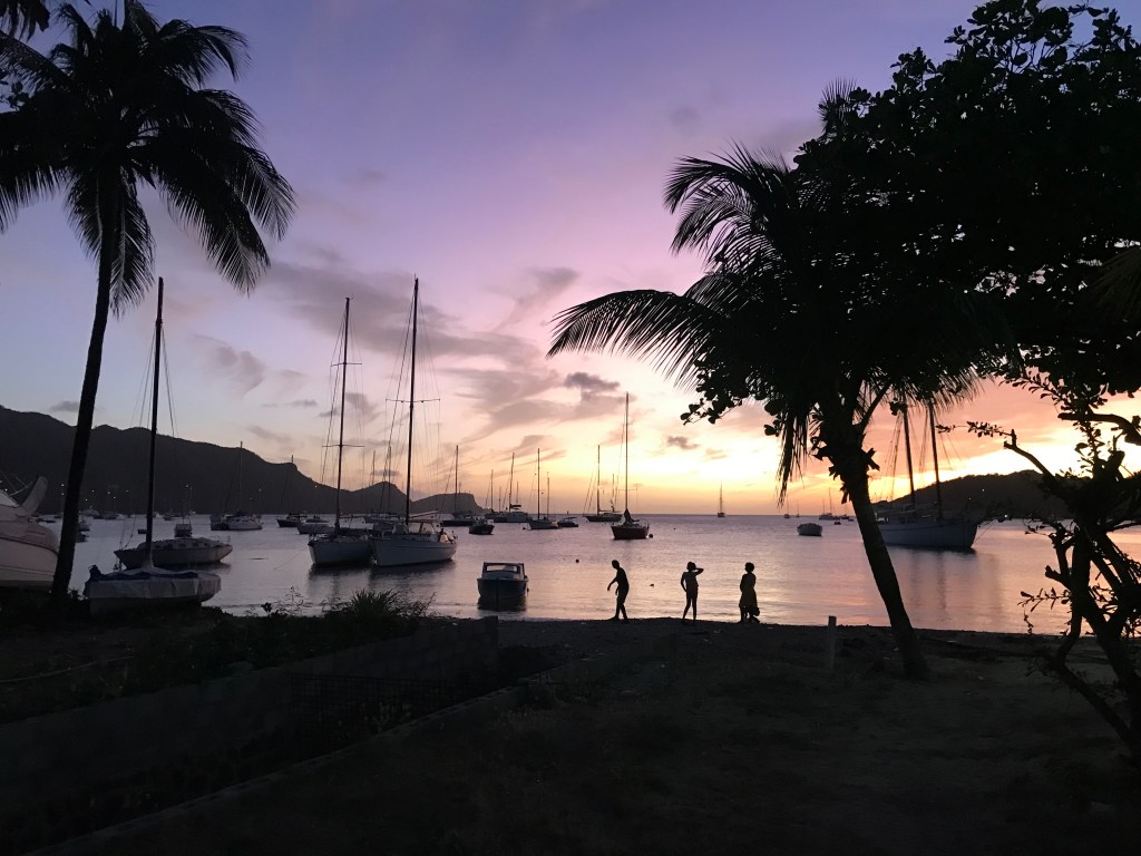 Terug op de drukke ankerplaats bij Sainte Anne besluiten we zo dicht mogelijk bij het dinghy dock voor anker te gaan. Gemak dient de mens en zo kunnen we dagelijks voor het ontbijt verse croissants, baguettes en pain aux chocolat halen. We vallen een beetje in een, het klinkt wat vreemd, vakantiemodus. Uitslapen, lezen een klein beetje onderhoud aan de boot en dat is het de komende dagen. Af en toe wisselen we het af met een wandeling door Sainte Anne en langs de kust richting de zoutpannen. Ook is er ’s avonds regelmatig wat te doen. Een van de positieve overblijfselen uit de Corona lock down periode zijn kleine concertjes op het achterdek van schepen. Het varieert van een verrassend pop harpconcert tot een avondje blues en rock met gitaar en saxofoon waarbij de bezoekers met aan elkaar geknoopte dinghy’s genieten van een biertje en een hapje.