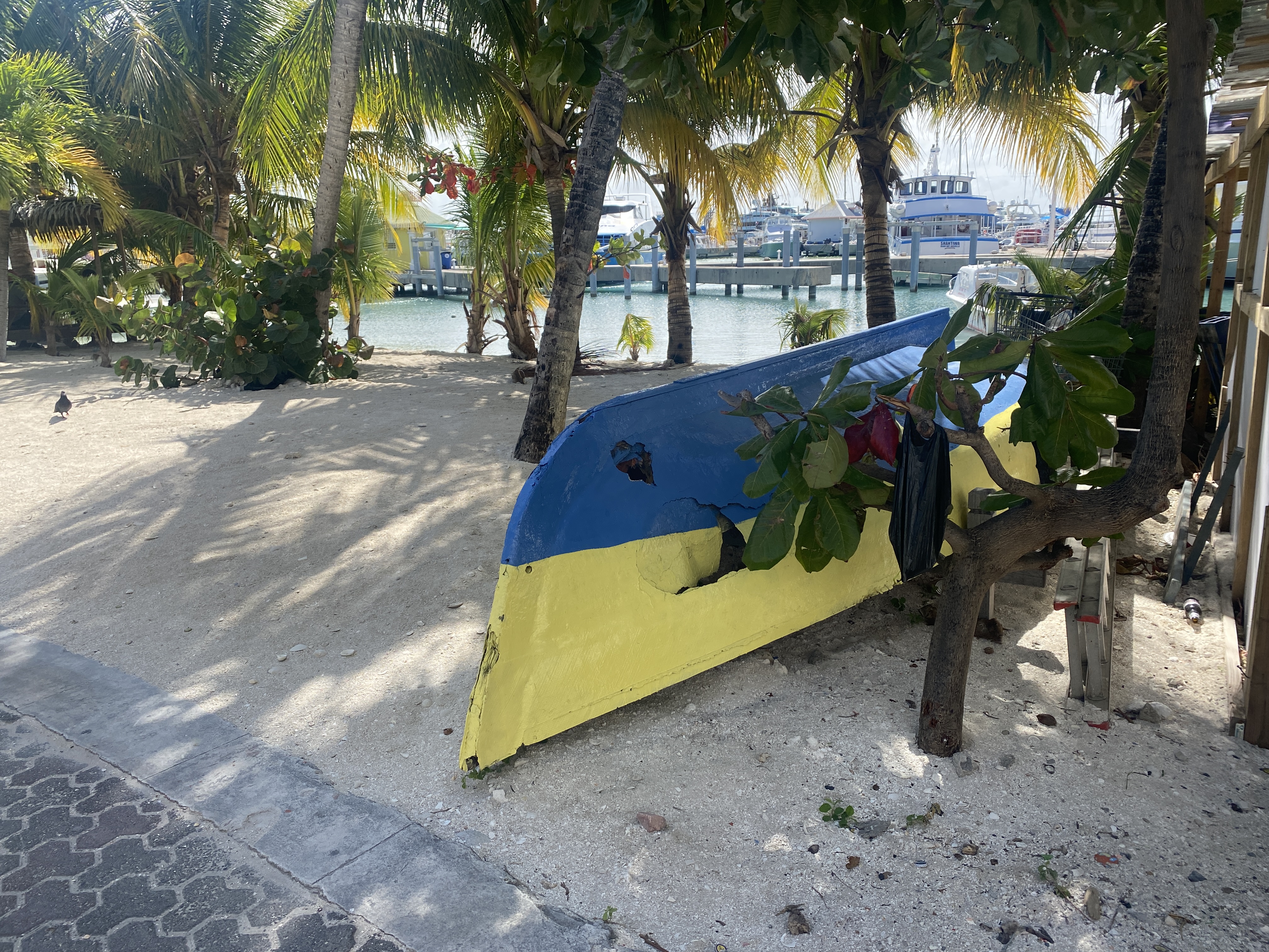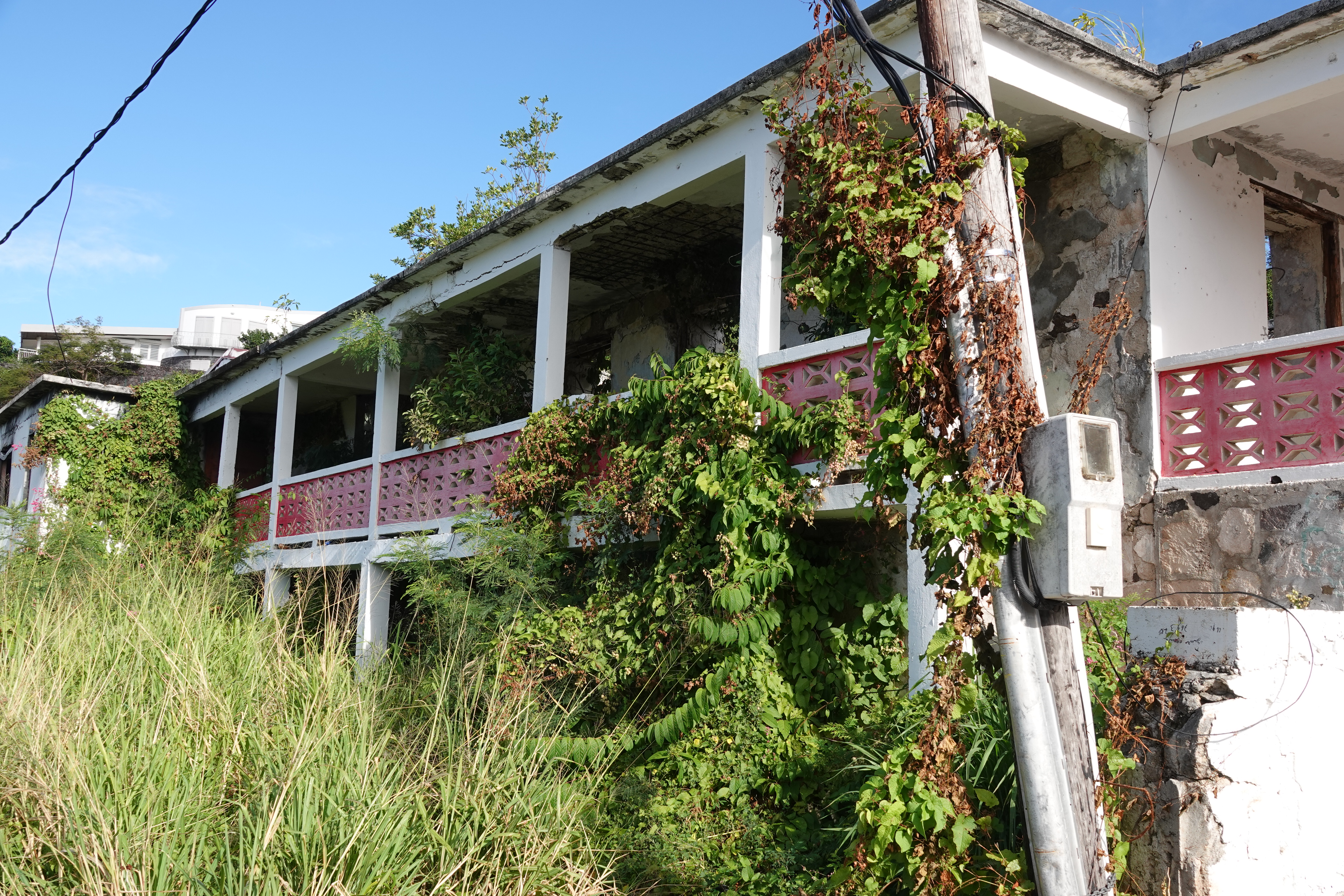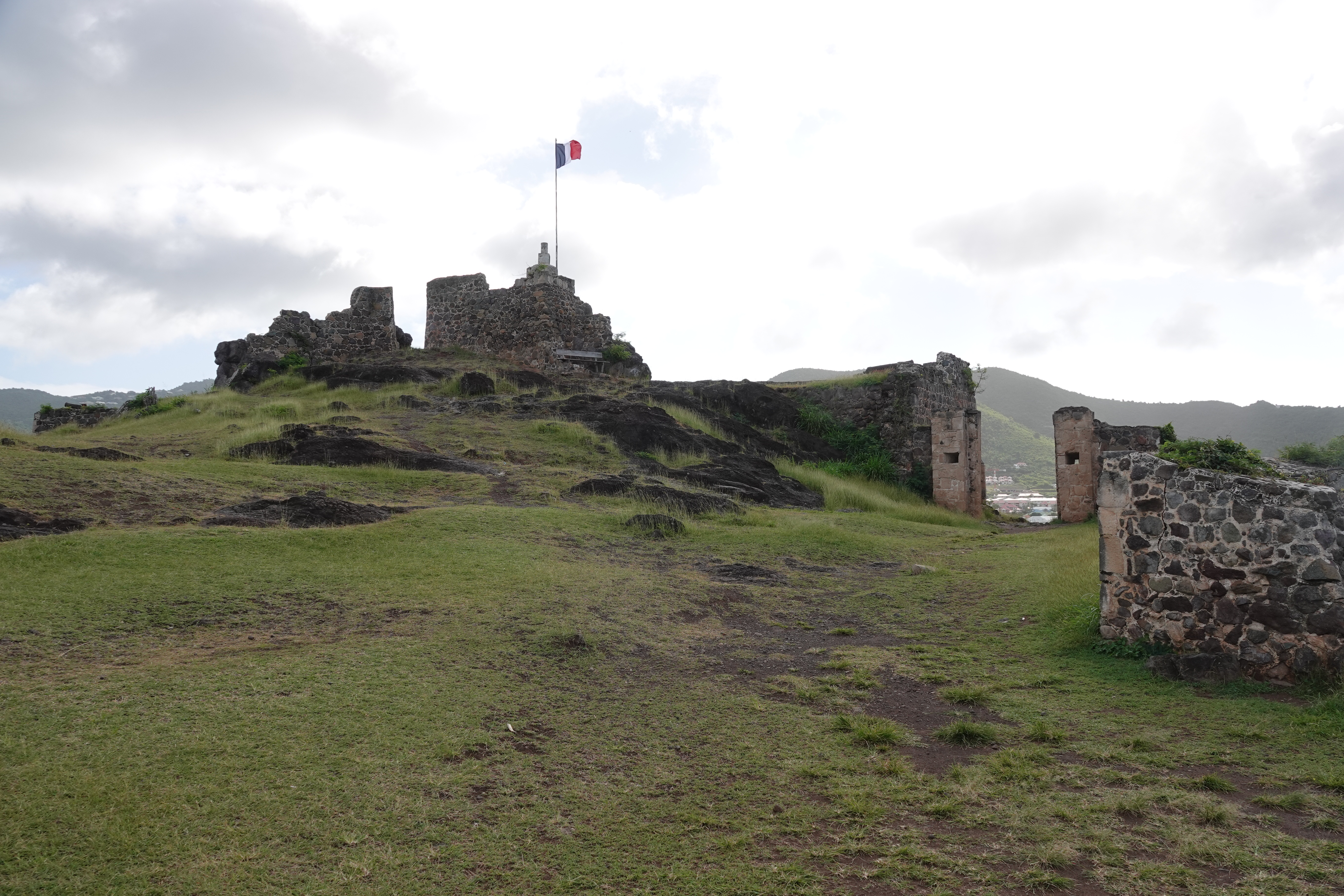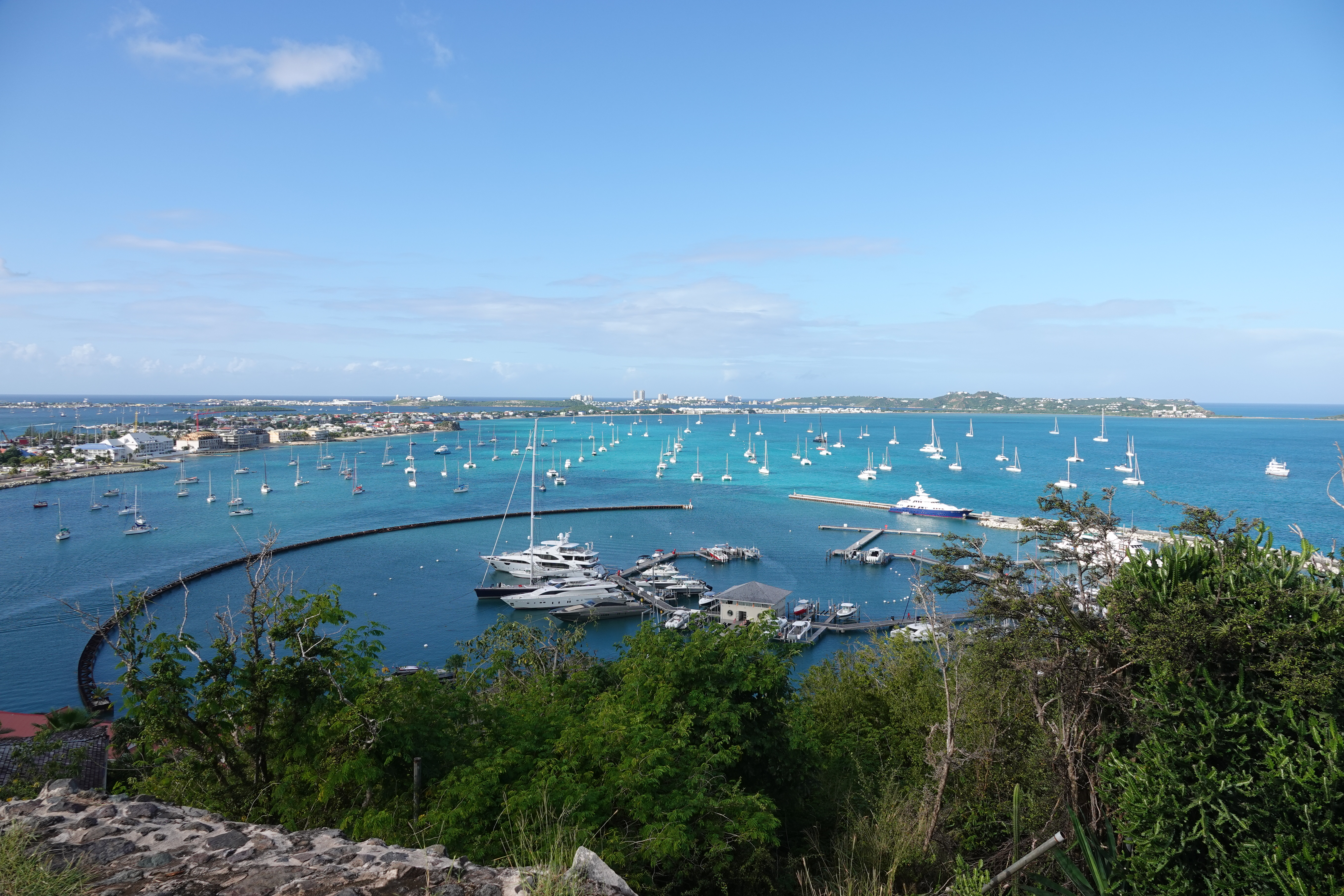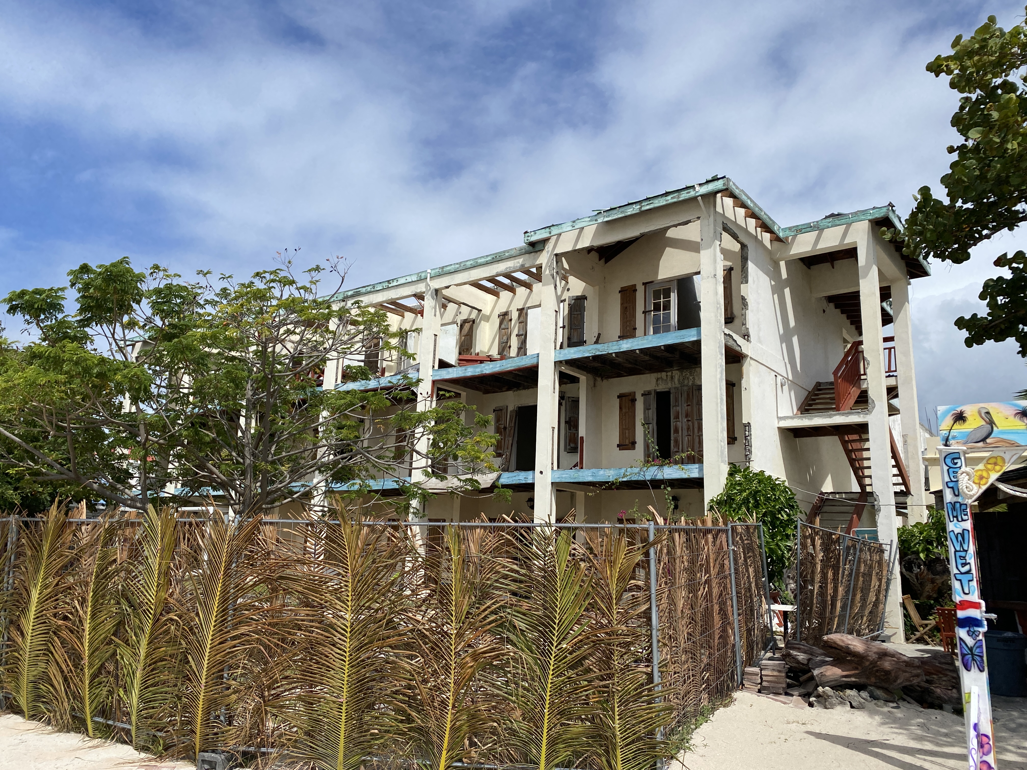 De volgende ochtend ben ik al vroeg wakker. Annette is nog in diepe rust en ik besluit de dinghy naar Marigot te pakken. Een kort rondje door het centrum laat zien dat de orkaan van 2017 zijn sporen heeft nagelaten. Om eerlijk te zijn, het is er niet op verbeterd. Her en der zie je nog stormschade aan de huizen en het geheel ziet er minder verzorgt uit dan toen ik hier was in 2008. Ik besluit de heuvel naar het fort op te wandelen. Van daaruit heb je een mooi uitzicht over de baai en de lagune. De gebouwen onderweg naar boven zijn voor een deel niet meer gerepareerd na 2017 en de coronapandemie heeft aan de voortgang van het herstel ook niet meegewerkt.