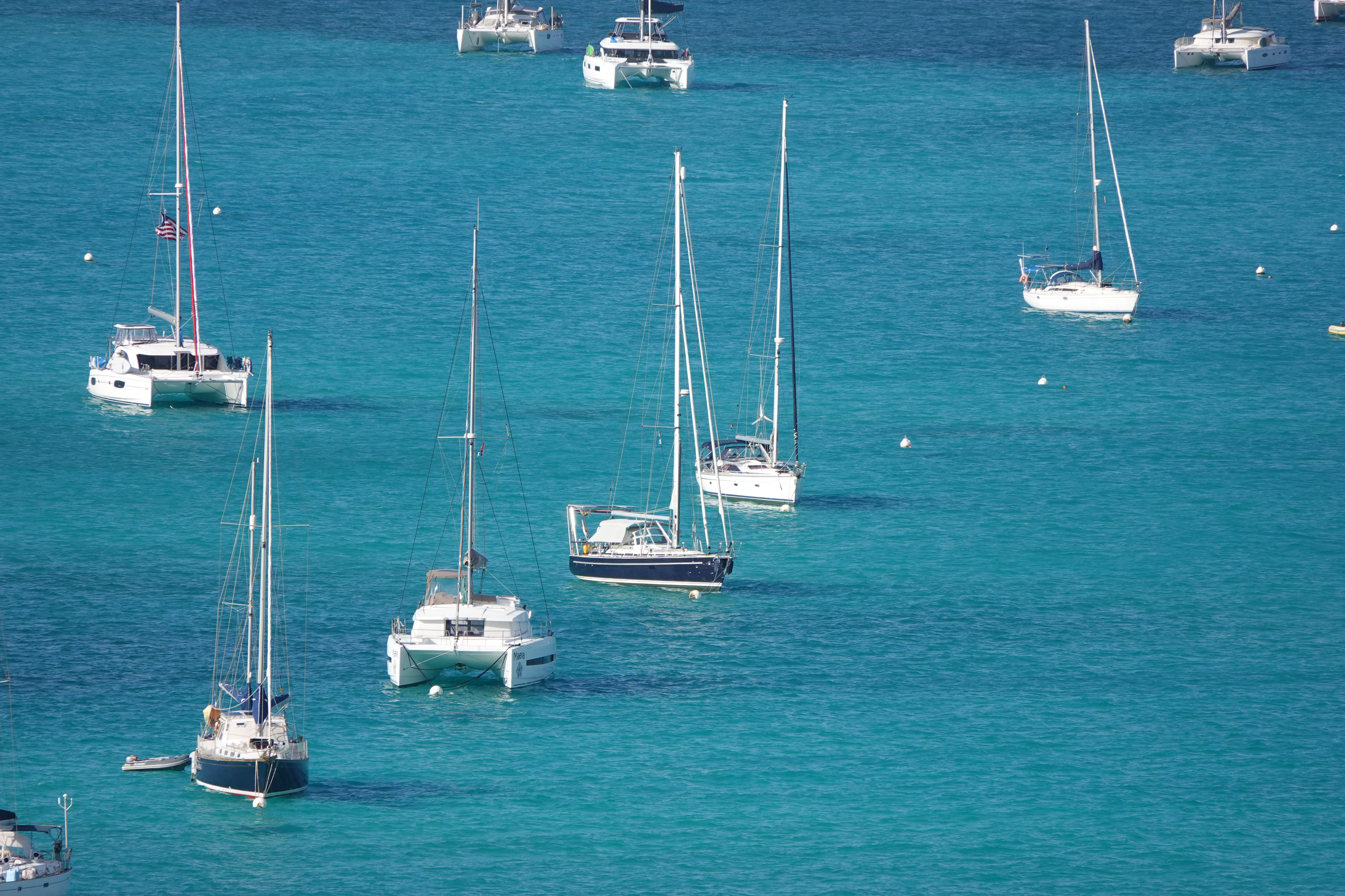 Het is druk in de baai en we varen door tot achteraan waar we in ca. 3 meter diep water ankeren. Dit blijkt een prima plek met een korte afstand tot de marina met dinghy steiger.