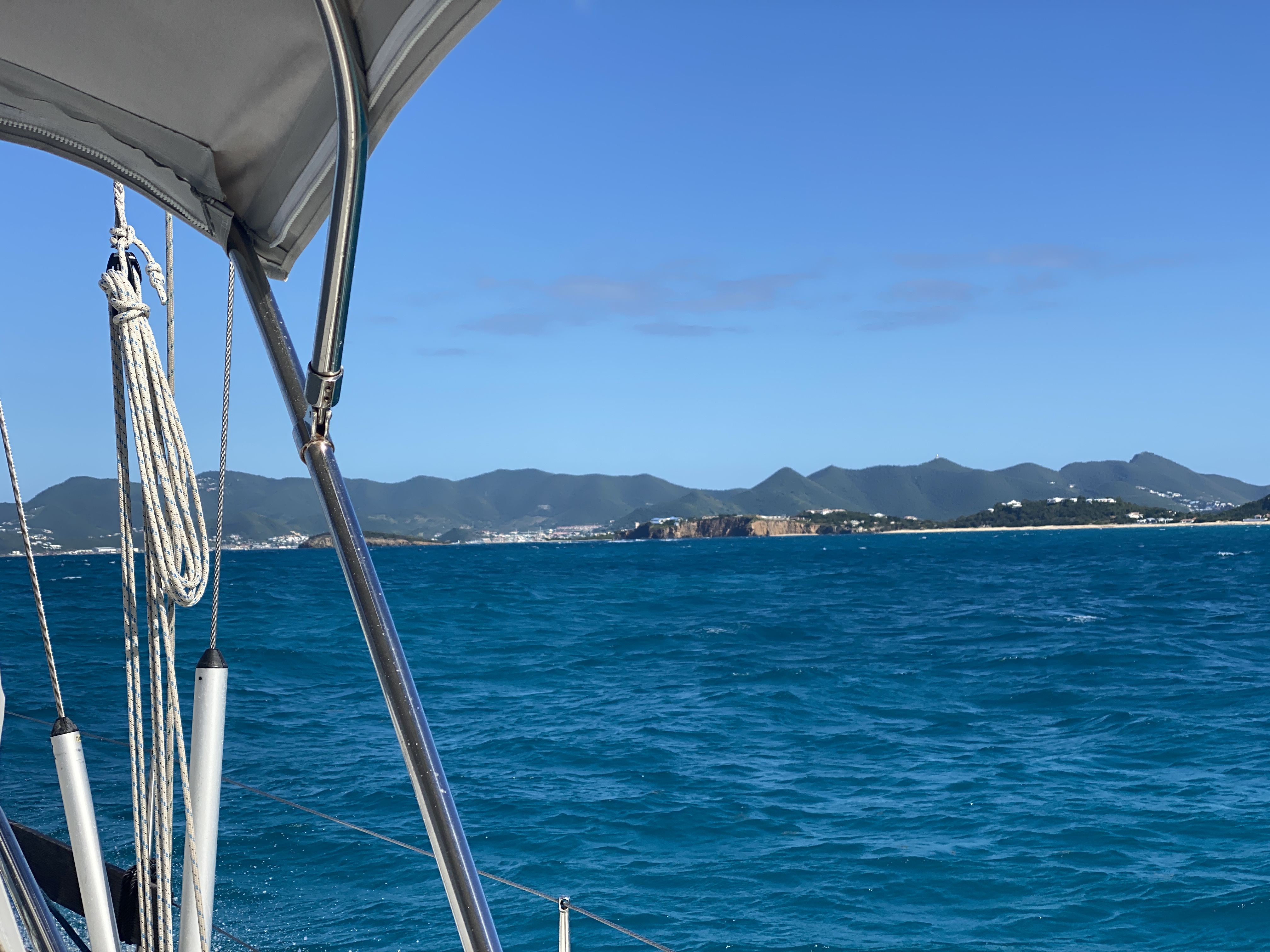 De wind is gedraaid naar het noordoosten en dat is net genoeg om zeilend Sint Maarten te kunnen bereiken. We verwachten er ruim een dag over te doen dus dat betekent een nachtje doorvaren. We passeren de British Virgin Islands gedurende de avond en nacht. We hebben besloten hier niet te stoppen vanwege de enorme drukte op de ankerplaatsen en de hoge kosten voor inklaren en mooring. Zoals vaak blijkt het venijn van de tocht in de staart te zitten. De oversteek van de BVI naar Sint Maarten blijkt hoog aan de wind met een pittig zeetje op de kop. Stuiteren dus! We krijgen bakken met water over maar het lukt ons om met slechts 1 extra slag de baai bij Marigot te bereiken. Rond half 5 komen we aan en worden we door Erik en Karin van de Marelief verwelkomd. Leuk hen na bijna een jaar, we hadden hen de eerder ontmoet op Tenerife en Martinique, weer terug te zien.