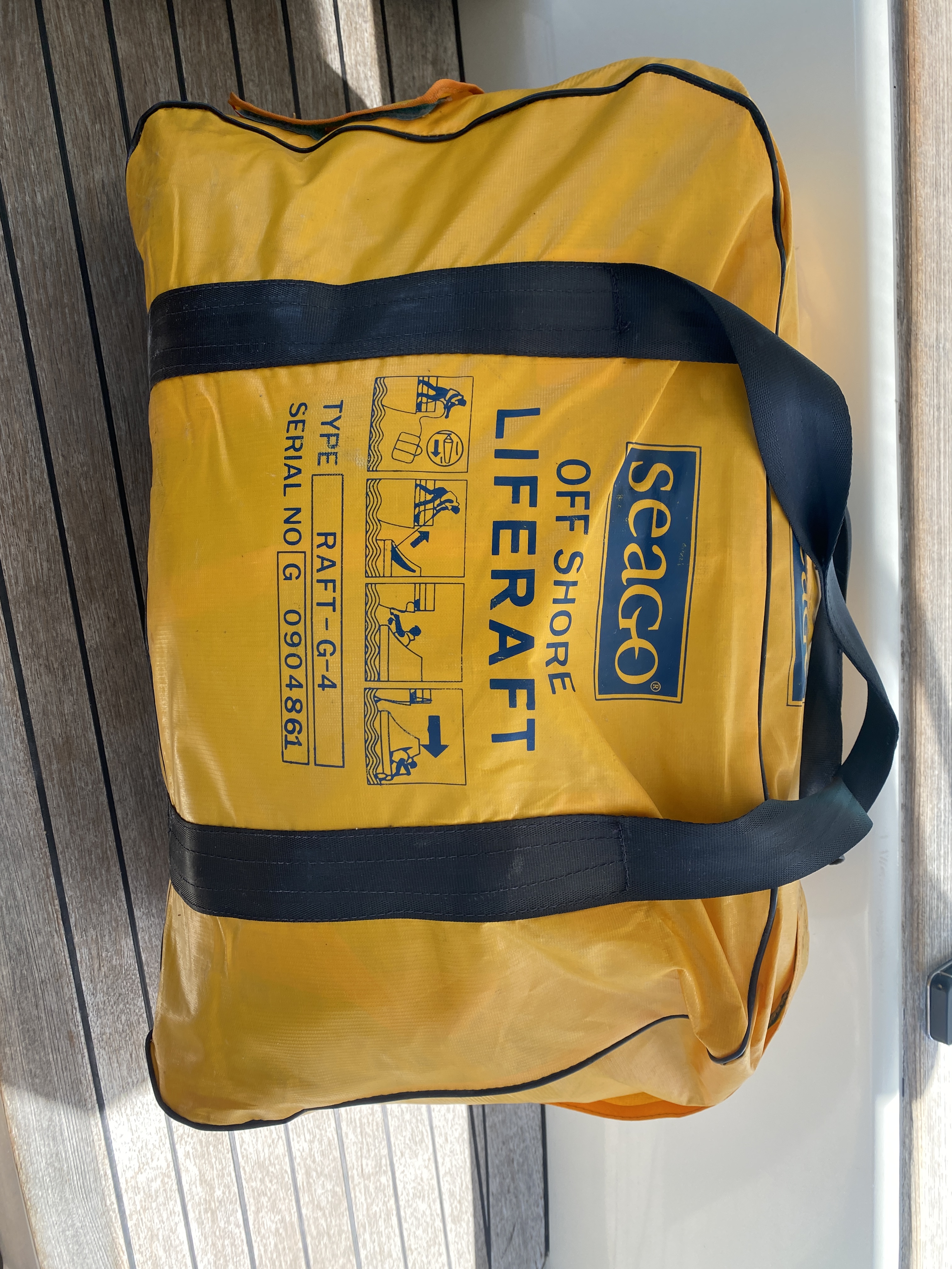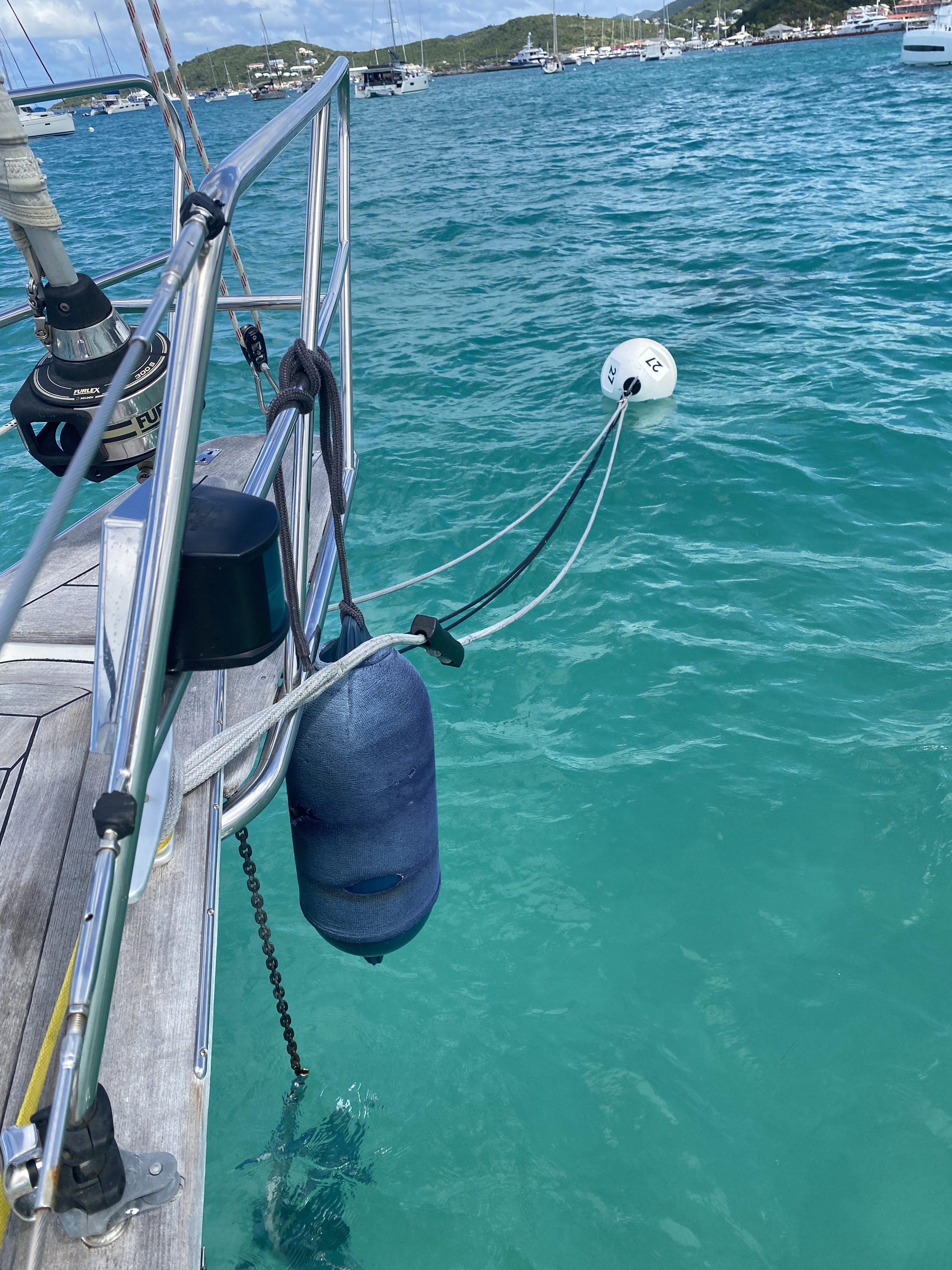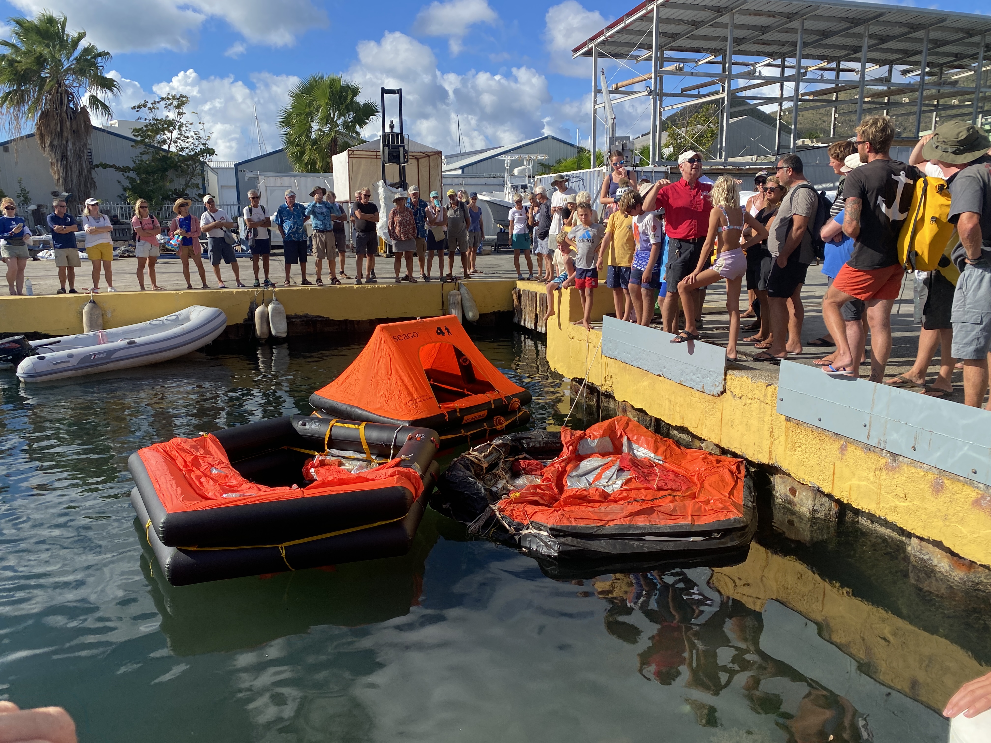 De ankerketting blijkt van 8 mm dikte naar een kleine 6 mm te zijn vermagerd. Hier brengt de haakseslijper uitkomst. Ik besluit 5 schakels te verwijderen zodat er weer een corrosievrij stuk aan het anker kan worden bevestigd. Wat rest is de keuring van het vlot. Dit blijkt niet mogelijk op Sint Maarten, althans niet voor ons vlot. Aangezien het vlot inmiddels al meer dan 15 jaar oud is besluiten we een nieuwe te kopen. Gelukkig hebben we een steekkarretje aan boord want het blijkt een wandeling van 3 km te zijn en dat met een vlot van meer dan 25 kg bij een temperatuur van ca. 30 graden is een behoorlijke uitdaging. Het oude vlot schenken we aan Island Water World waar later een seminar wordt gegeven over het oversteken van de oceaan met een demonstratie van het gebruik van een reddingsvlot. Lekker opwekkend! Overigens blijkt ons vlot het als enige van de gedoneerde vlotten nog prima te doen…