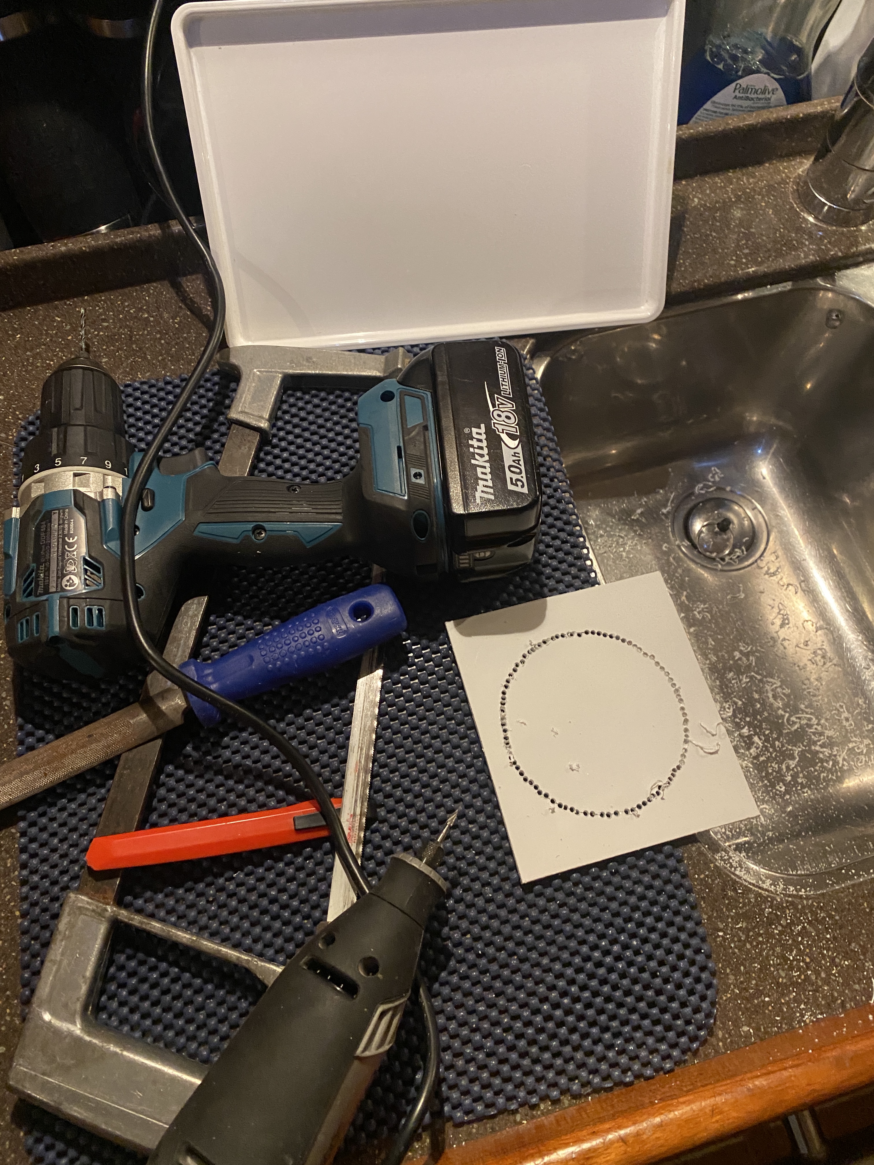 De dieptemeter en log lijken definitief overleden en we besluiten alle oude ST60 apparatuur te vervangen voor nieuwe i70 klokjes van Raymarine. Deze blijken in Bermuda (net als alles) onbetaalbaar. Maar hiervoor hebben we een oplossing en dat is Kees (Boon). Kees zal in Bermuda de plaats innemen van Annette die de oversteek van Bermuda naar de Azoren graag aan zich voorbij laat gaan. We bestellen de spullen bij Dekker Watersport die een aanbieding van een complete set meters heeft en ons nog wat extra korting geeft. Alles wordt op tijd bij Kees in Hellevoetsluis afgeleverd en zal later door Kees vakkundig Bermuda worden binnen gesmokkeld :-). Helaas zijn de afmetingen van de nieuwe apparatuur niet gelijk aan de oude en moet er dus ook een nieuw teakhouten plaatje komen om ze definitief te huisvesten. Dit zal door Annette uit Nederland naar de Azoren worden meegebracht. Tekeningetje mee en IJtama doet de rest… Tijdelijk brengt wederom een deksel van een Ikea bakje uitkomst bij de montage van de meters.