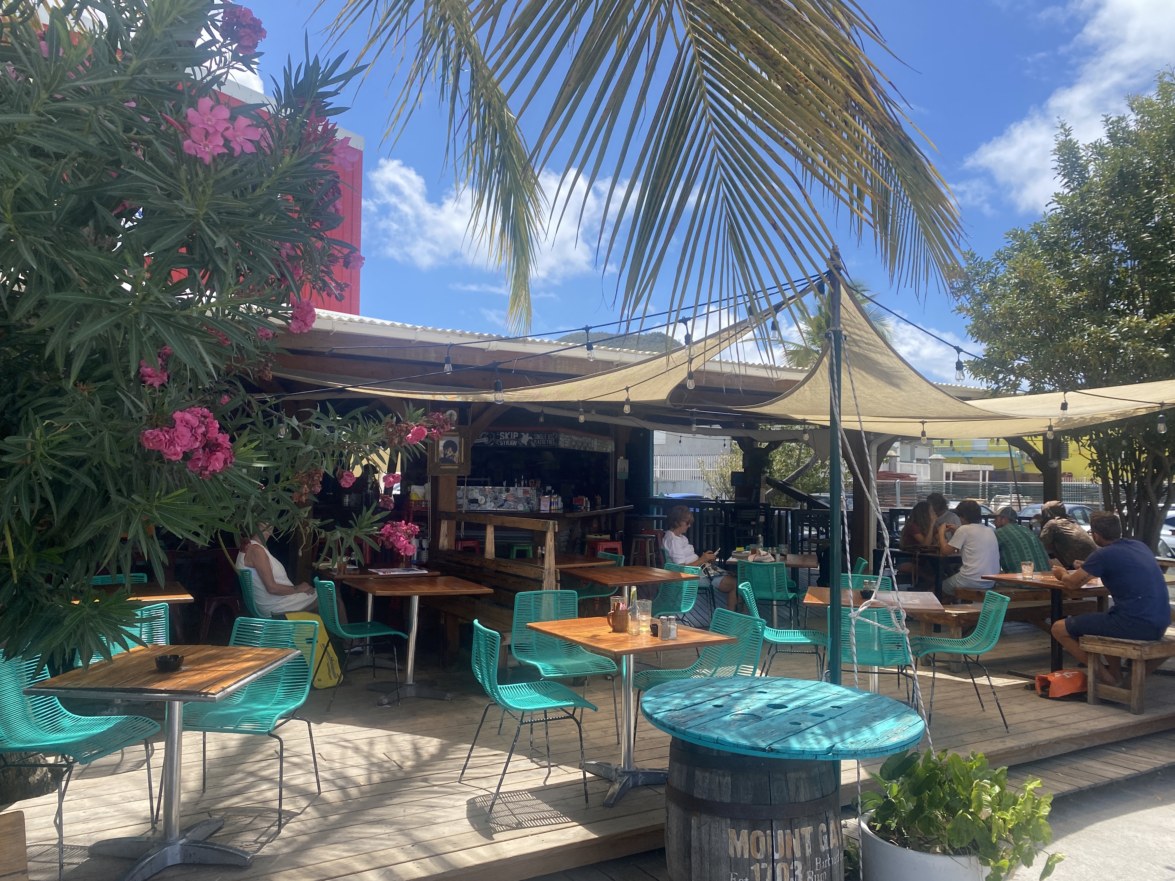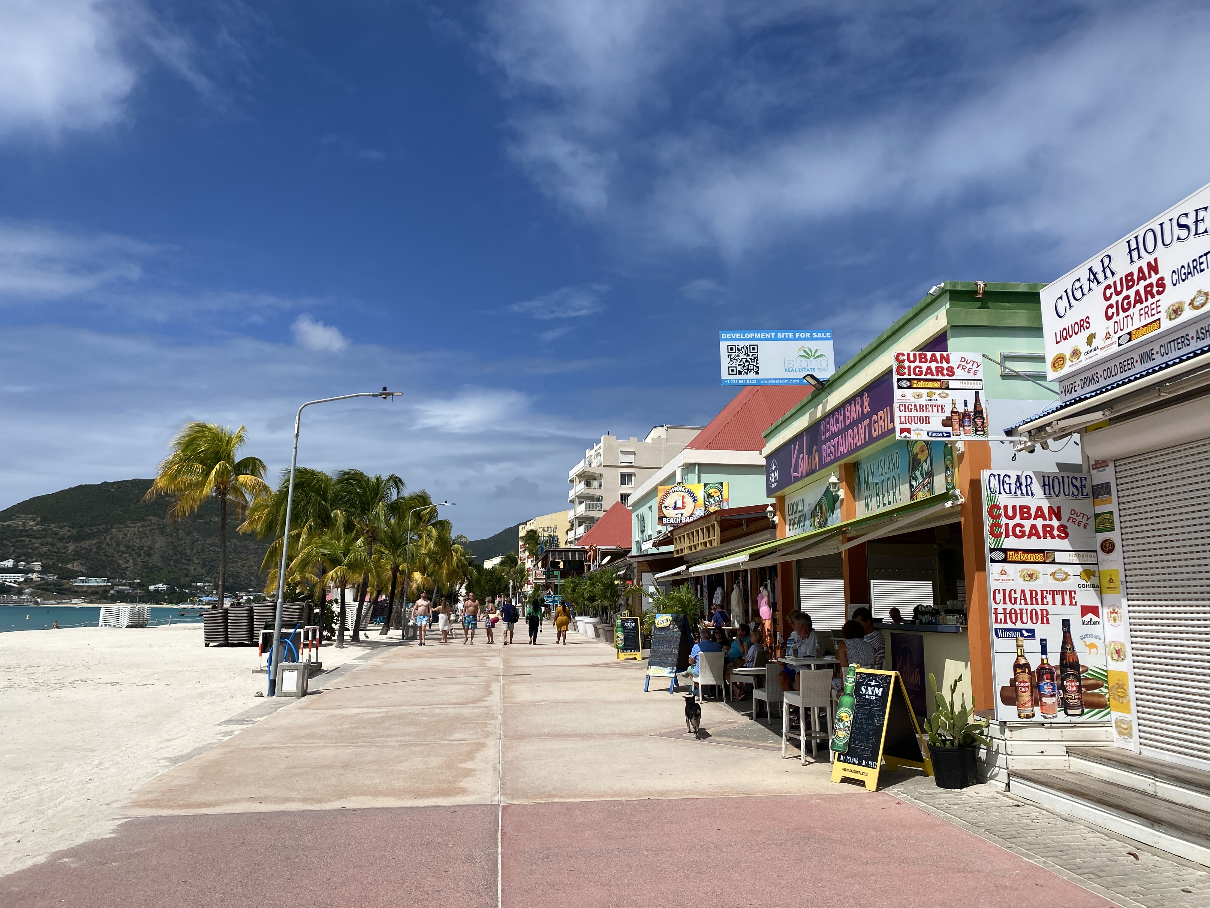 Begin van de middag klaren we in bij de Nederlandse douane. Een verademing; efficiënt, vriendelijk en duidelijk. Dat hebben we lange tijd gemist. Op de terugweg van de douane passeren we de bekende Karels Beach Bar en we besluiten met Michiel en Annette om een tussenstop te maken voor een biertje, bitterballen en frikandelletjes.