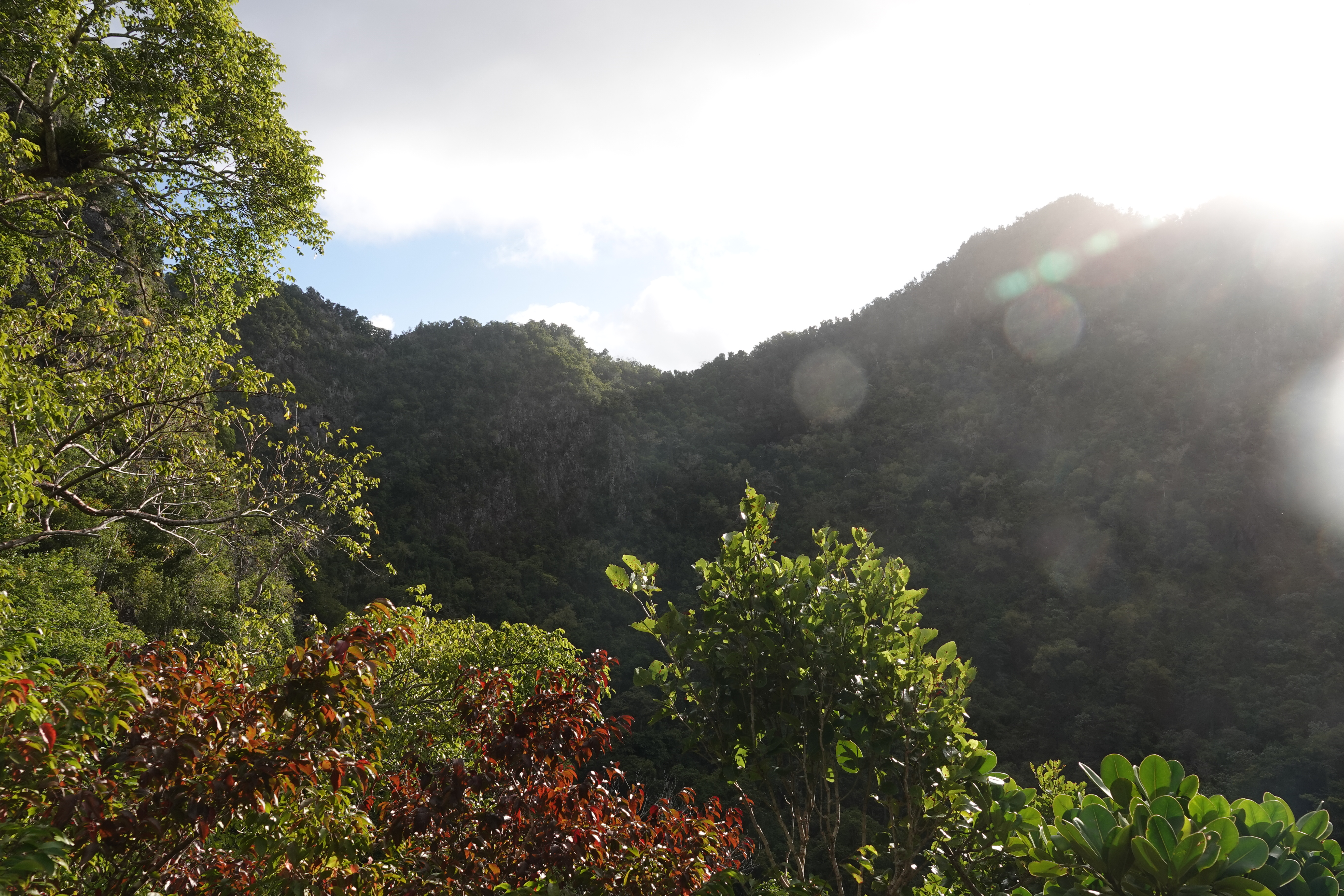 Midden in het regenwoud ligt een prachtige botanische tuin. De weg er naartoe leidt langs de drukke omgeving van Fort de France maar verder in het binnenland wordt het rustiger en doet het regenwoud zijn naam eer aan. De regen komt met bakken uit de hemel. Eerst koffie dus voor dat we de botanische tuin ingaan in de hoop dat de regen afneemt. Uiteindelijk brengen we het er daar droog vanaf en genieten van de kolibries, de planten en het mooie uitzicht over het regenwoud.