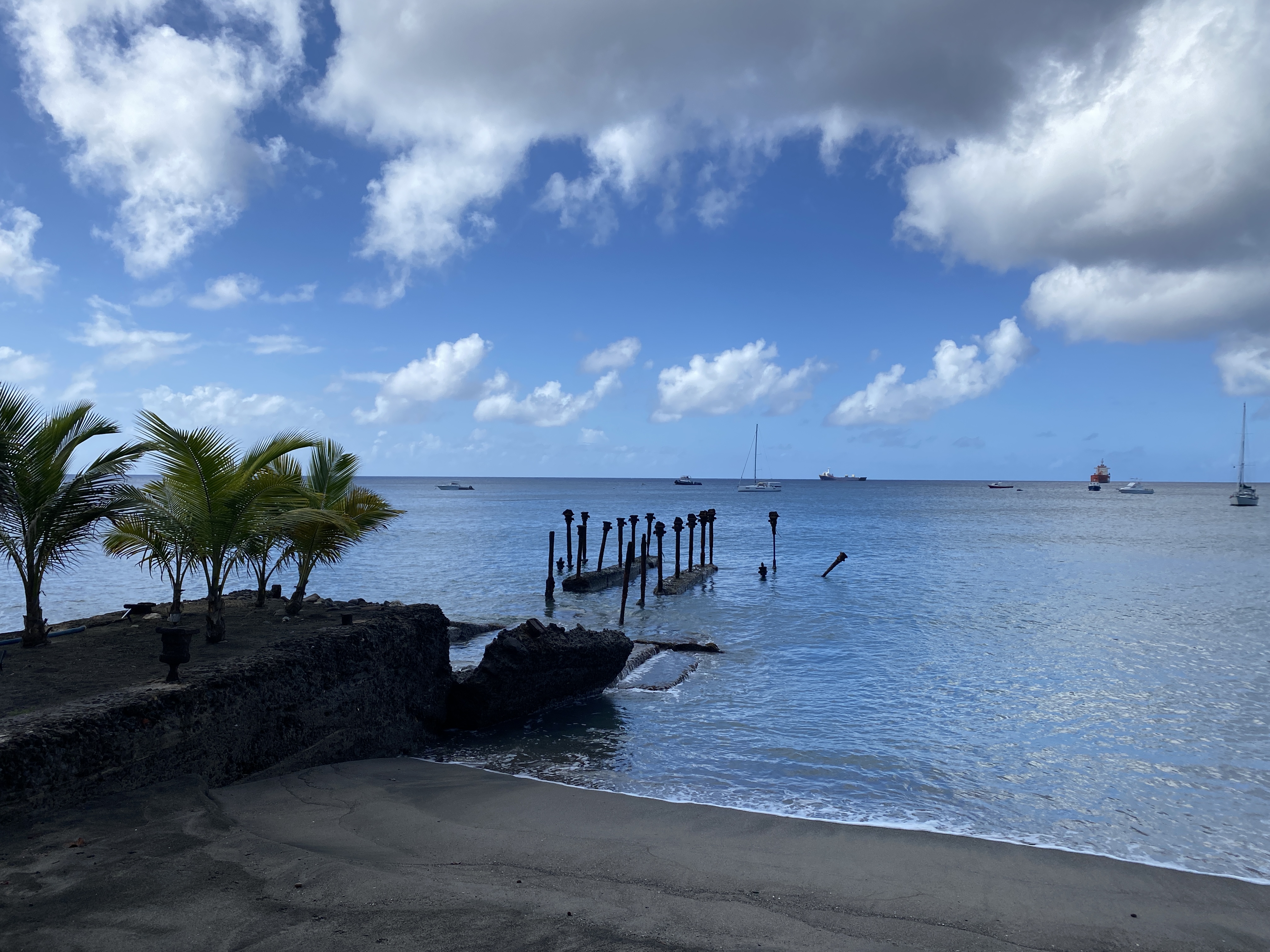 We vervolgen onze weg voor een wandeling door het regenwoud maar zien hier vanwege de enorme buien vanaf en rijden door naar Saint-Pierre. Dit was ooit de hoofdstad van Martinique maar na een enorme verwoesting als gevolg van een vulkaanuitbarsting in 1902 is deze rol overgenomen door Fort de France. Een aantal ruïnes van beeldbepalende gebouwen uit die tijd zijn nog te zien en er is een klein maar interessant museum over de ramp. We lunchen er aan het strand en zien grote aantallen witte krabben enthousiast gaten graven om zich hier vervolgens in terug te trekken. Voor de kust liggen wat zeilboten vooranker maar het rolt er flink en we besluiten dan ook om de boot in Sainte-Anne te laten liggen de komende dagen.