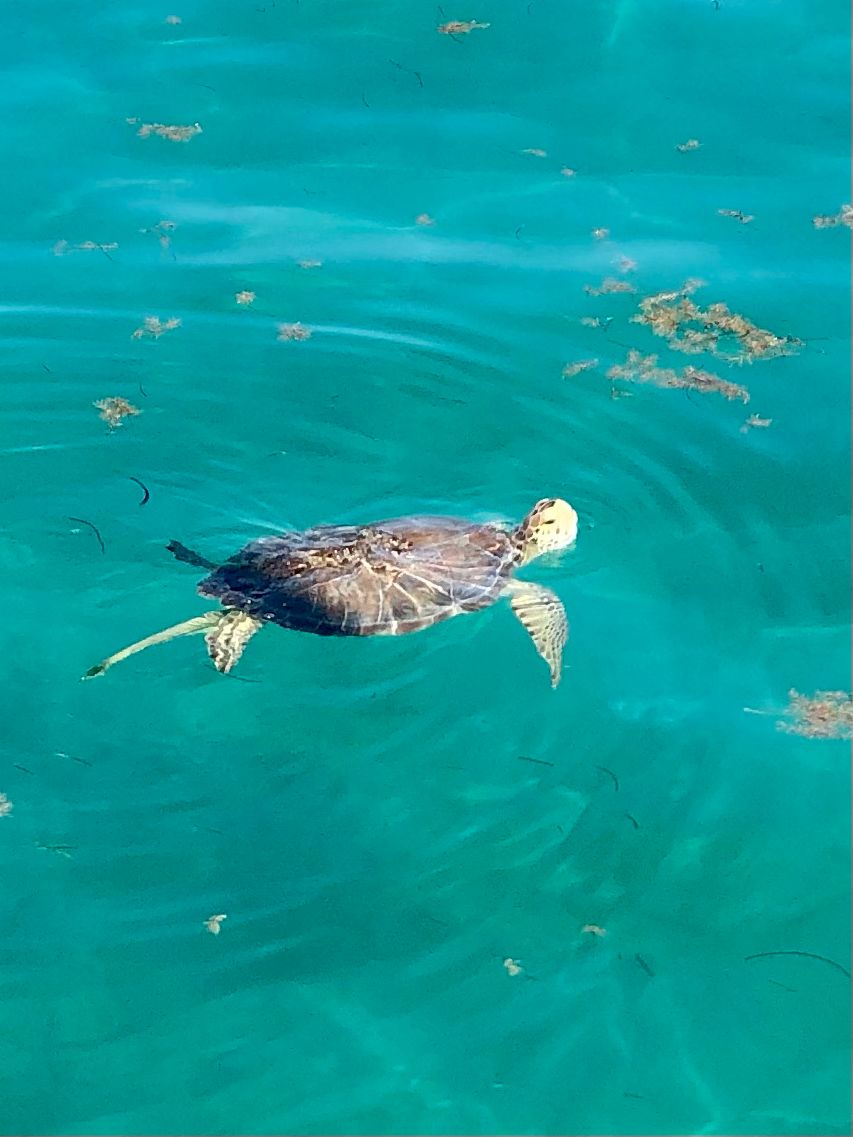 Dit eilandje ligt in het midden van het beschermde gebied voor zeeschildpadden. Er is een mooring vrij direct naast de boeienlijn die het beschermde gebied afschermt. Al direct zien we meerdere zeeschildpadden rondzwemmen. Ze lijken zich weinig aan te trekken van de voor anker liggende schepen en komen regelmatig boven tijdens het grazen tussen het turtle grass waarmee de bodem is bedekt. Hoewel ankeren tussen de meerboeien is toegestaan wordt het niet aanbevolen. De ankers ploegen de bodem om en beschadigen daarbij het turtle grass wat zich maar zeer traag herstelt. De kosten van een mooring zijn $ 10 per dag en zou dus voor niemand een onoverkomelijk bedrag moeten zijn. Helaas zie je toch nog her en der boten het anker uitzetten en tijdens het duiken krijg je helaas vele kale plekken op de bodem te zien waar eerst turtle grass stond.
