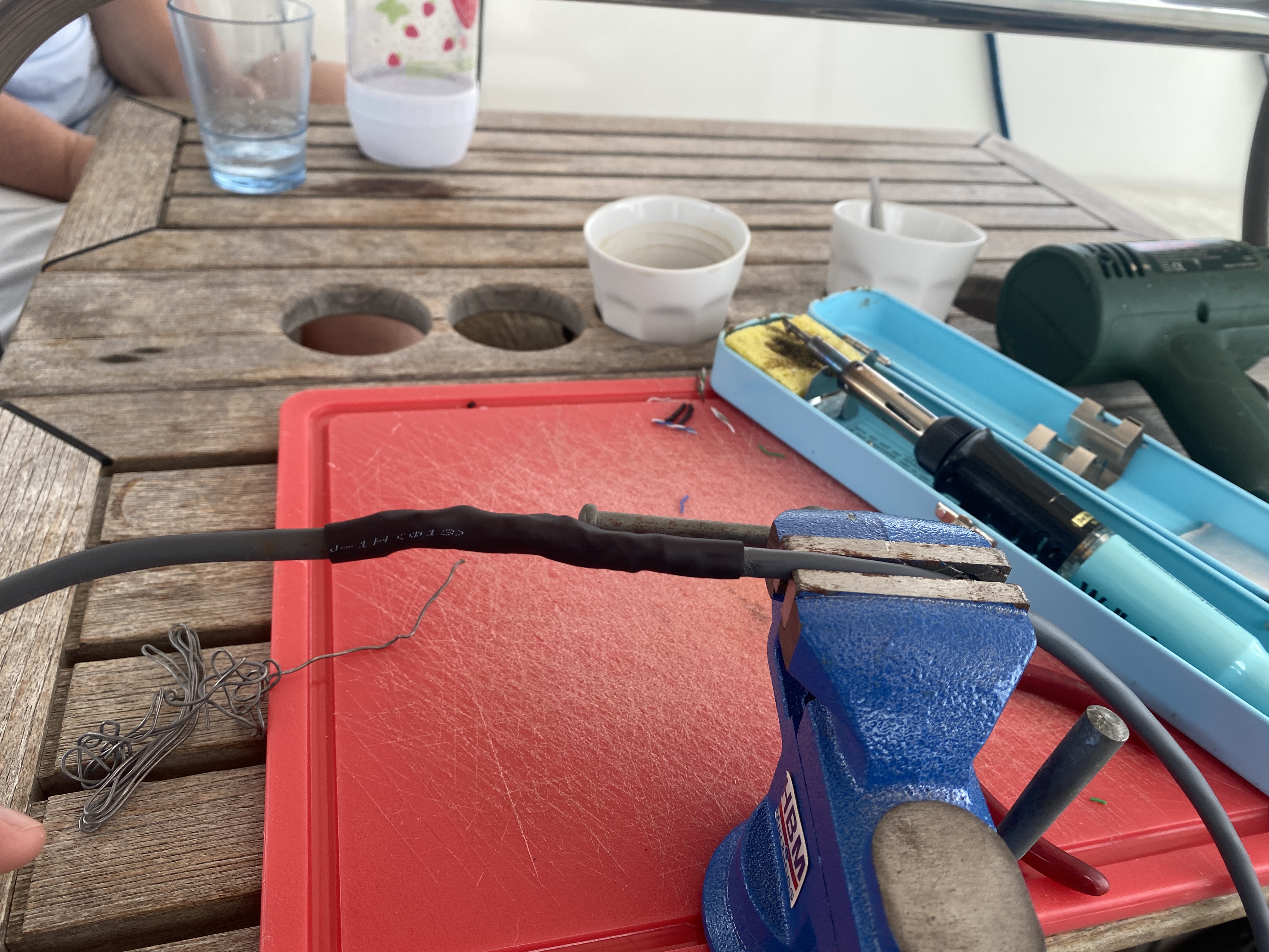 Inmiddels is de boot aan wat onderhoud toe. Het display en de bediening van de stuurautomaat heeft het begeven, de laatste schakel van de ankerketting bij de bevestiging aan het anker is wat erg dun geworden en het vlot is inmiddels bijna een jaar over de keuringsdatum. Gelukkig is op Sint Maarten echt alles wat je kan bedenken te koop en is de dichtst bijzijnde watersport winkel op 5 minuten varen met de dinghy. Allereerst vervang ik de bediening van de stuurautomaat. Gelukkig blijkt de nieuwe beddenunit van Raymarine compatibel met de oude waardoor dit een eenvoudig klusje lijkt. Met de nadruk op lijkt want het blijkt dat de maten niet overeenkomen en dat ik een oplossing moet zien te vinden om de boel goed dicht te krijgen. Het deksel van een Ikea doos blijkt de oplossing. Hieruit fabriceer ik een passtuk waarna de rest kinderspel was en de stuurautomaat weer kan worden gebruikt.