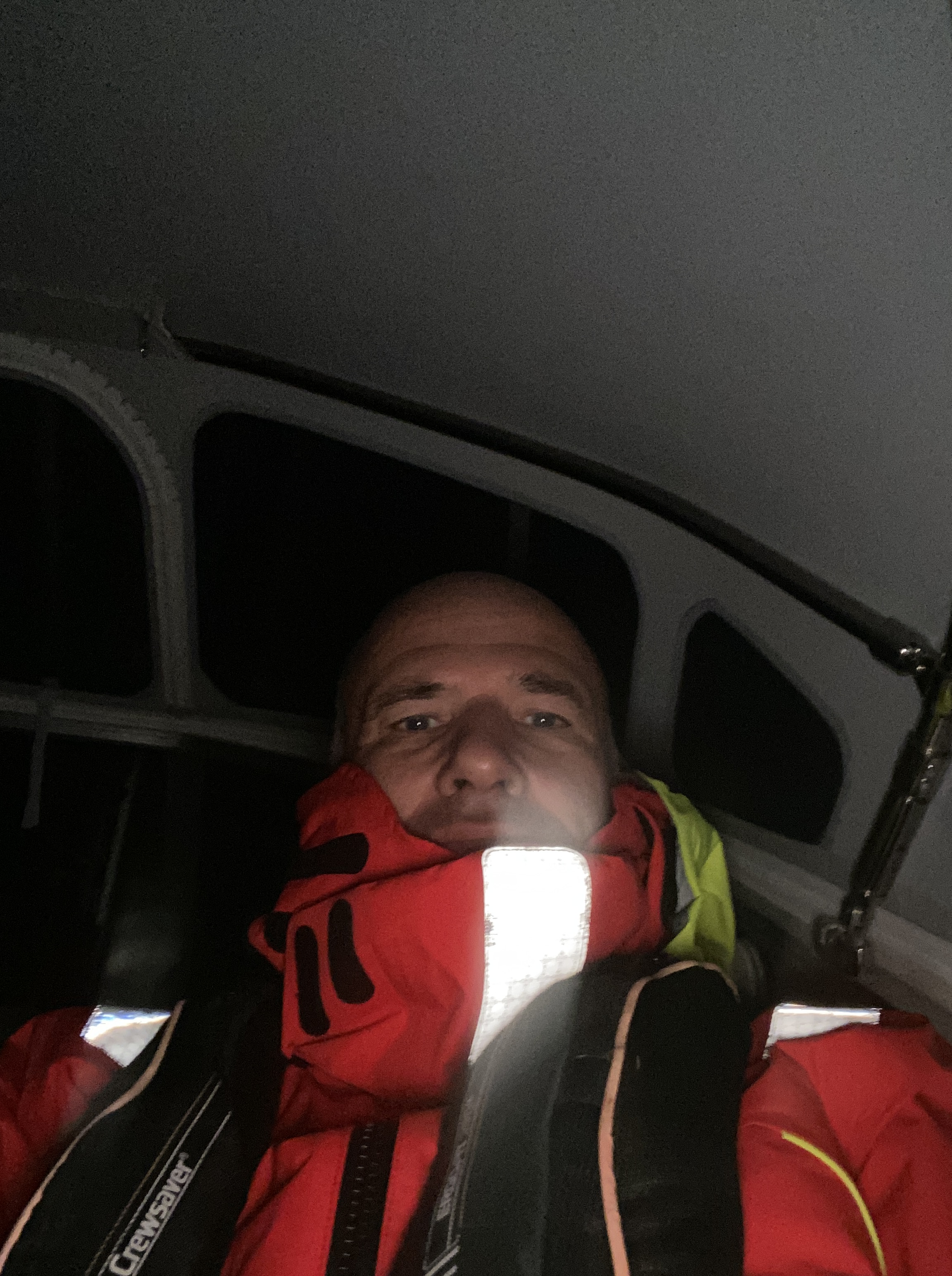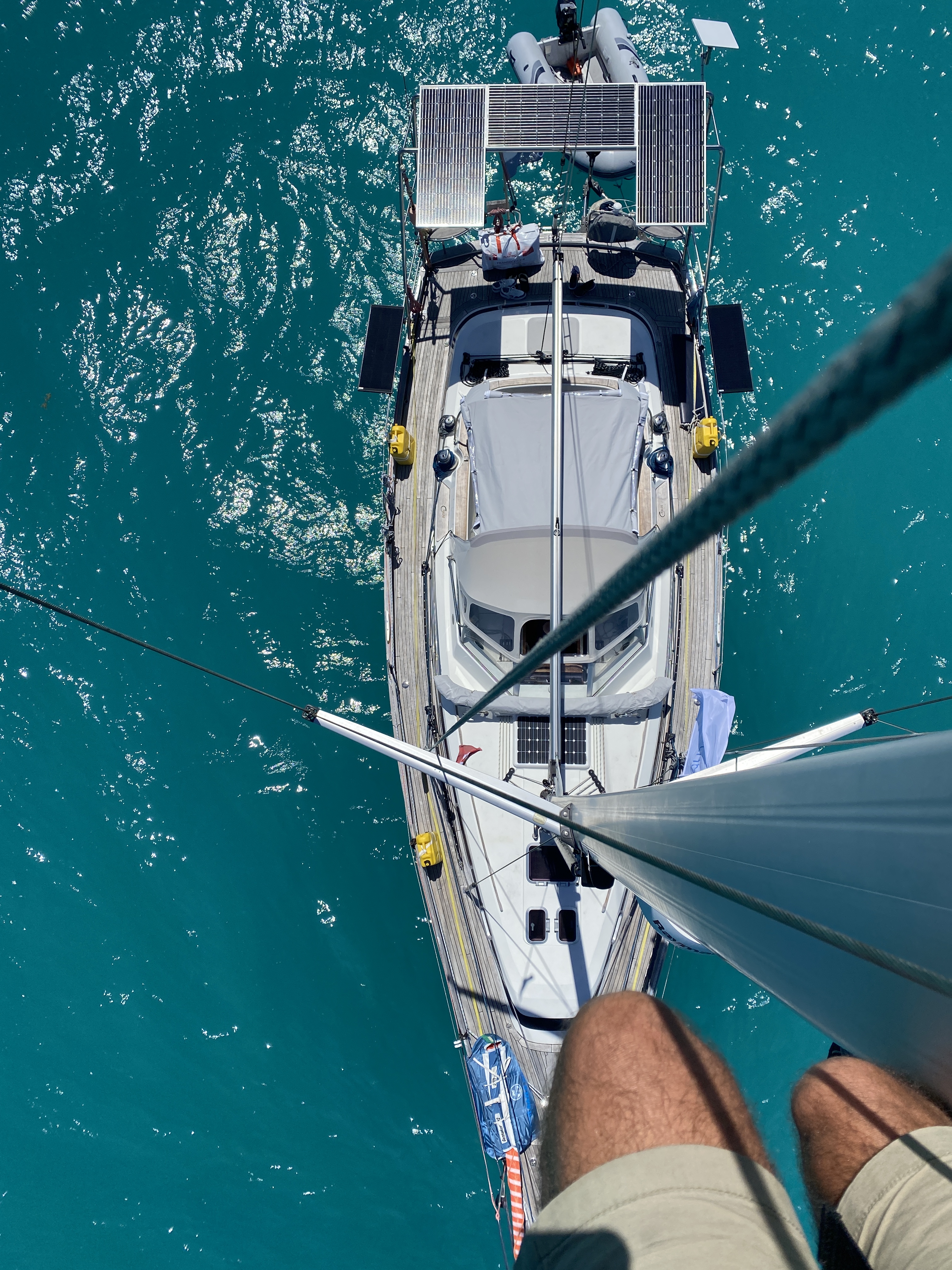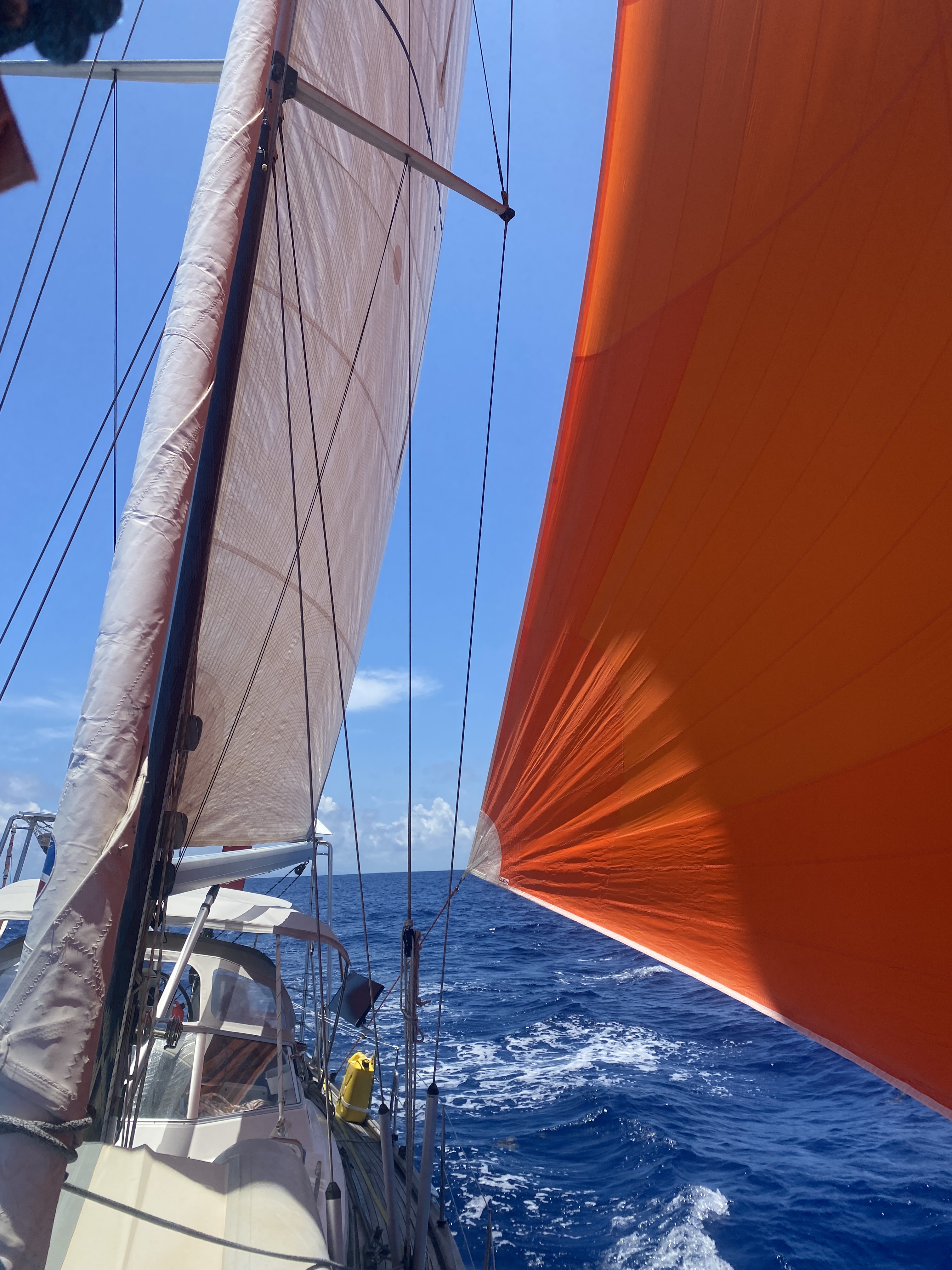 Om de stagfok binnen te krijgen moet ook ik naar het voordek. Natuurlijk zijn we beiden goed aangelijnd en kunnen we onze energie volledig richten op het naar binnen sleuren van het zeil. De stagfok kan met dit weer eigenlijk niet worden gemist en we besluiten om de furler van Code 0 (ons grote oranje lichtweer zeil) te gebruiken om de stagfok weer in de lucht te krijgen. Al met al zijn we een flink uur in de weer geweest om het euvel te fixen en kunnen we de rest van de tocht probleemloos voortzetten.