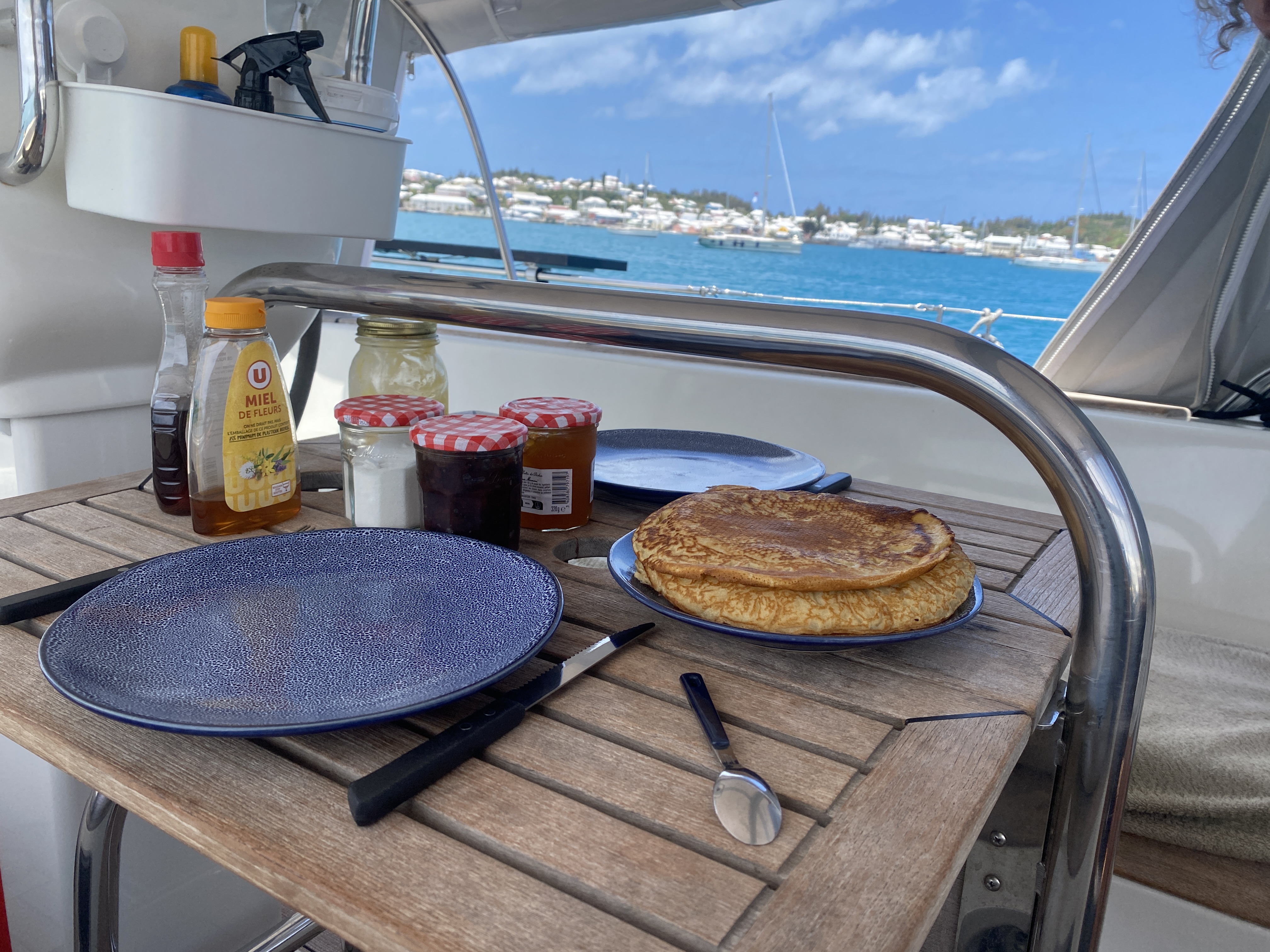 Inmiddels nadert de dag waarop Annette even naar huis gaat. We lopen nog een rondje in de omgeving, eten oerhollandse pannenkoeken en Annette bereidt de nodige maaltijden voor de oversteek naar de Azoren. Gevacumeerd en ingevroren hebben we voor het grootste deel van de oversteek de warme maaltijden klaar. Geen overbodige luxe want het belooft een minder comfortabele oversteek te worden waarin we worden achtervolgd door lage druk gebieden die aan de lopende band ontstaan aan de oostkust van de VS. Dit vooruitzicht is de reden dat Annette, die veelvuldig zeeziek is, deze oversteek aan Kees en mij overlaat. Dit blijkt later een verstandig besluit en we blijken niet de enige boot die om deze reden in Bermuda een tijdelijke bemanningswisseling heeft.