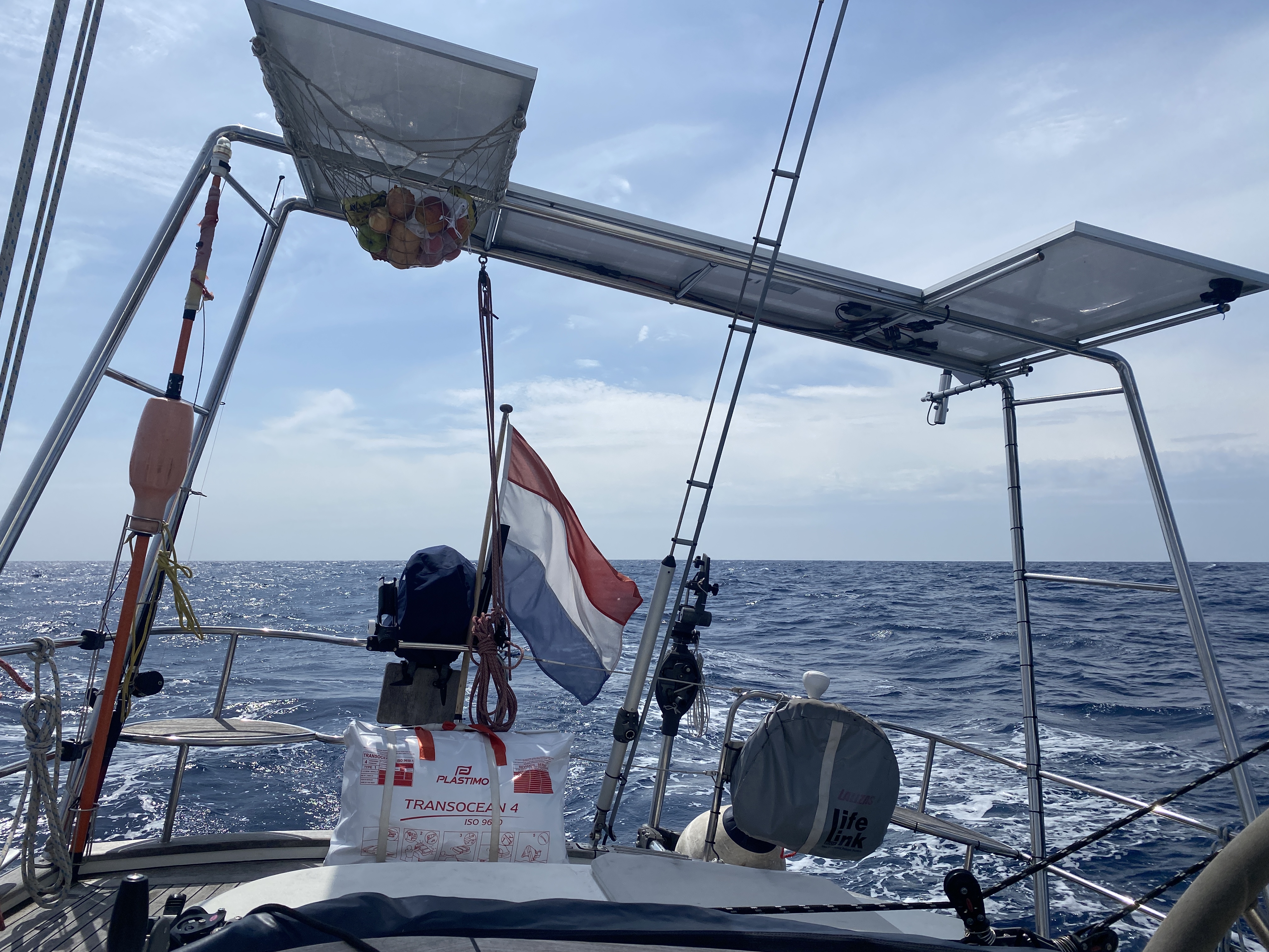 Ik besluit mijn duikspullen aan te trekken en in plaats van het mes een stevige schaar (van Ikea!) mee te nemen voor een nieuwe poging om de schroef te bevrijden. Dit bleek de oplossing. In nog geen 10 minuten sta ik, levend en wel, en met een visnet van zo’n 15 vierkante meter op het achterdek. Missie geslaagd. De schroef en saildrive lijken geen schade te hebben opgelopen. De motor loopt weer prima. Ik wacht nog even tot het water in de boiler is opgewarmd en duik vervolgens onder een warme douche. Een zwempartij onder een stampende boot midden op de oceaan, die daar meer dan 3 km diep is, gaat je toch niet helemaal in de koude kleren zitten..